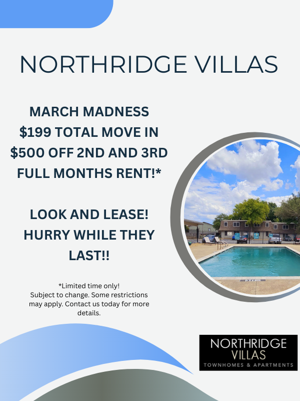 Northridge Villas offers one, two and three bedroom floor plans as well as two and three bedroom townhomes, with the amenities your sure to enjoy, like a sparkling swimming pool, pet park, playground, courtyards and so much more.
